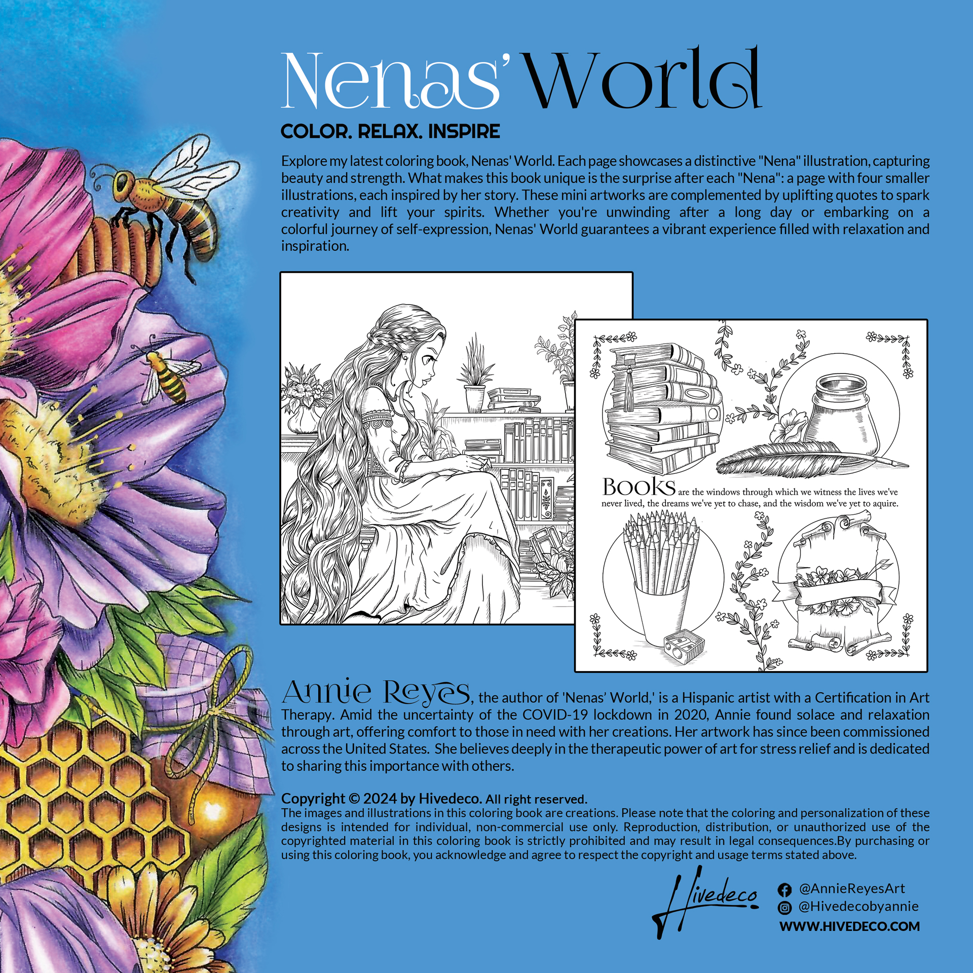 Explore my latest coloring book, Nenas’ World. Each page showcases a distinctive “Nena” illustration, capturing beauty and strength. What makes this book unique is the surprise after each “Nena”: a page with four smaller illustrations, each inspired by her story. Uplifting quotes complement these mini artworks to spark creativity and lift your spirits.